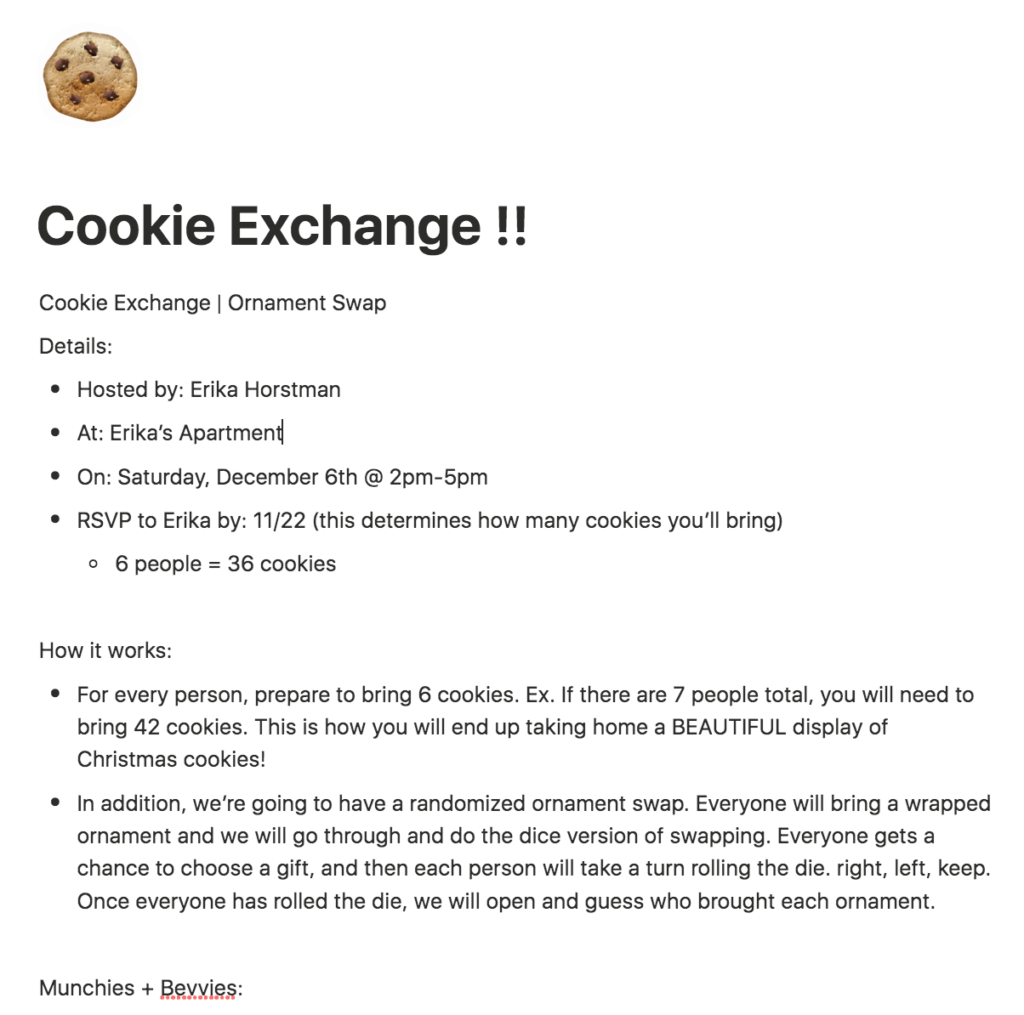 Once I got all of my main details figured out, I created a Facebook event and listed out what everyone could expect for our festive day. I had everyone prepare to bring a half dozen cookies per person who RSVPed, a wrapped ornament for a mini gift swap and opened up the food menu to let everyone, who wanted to, bring a dish to pass.